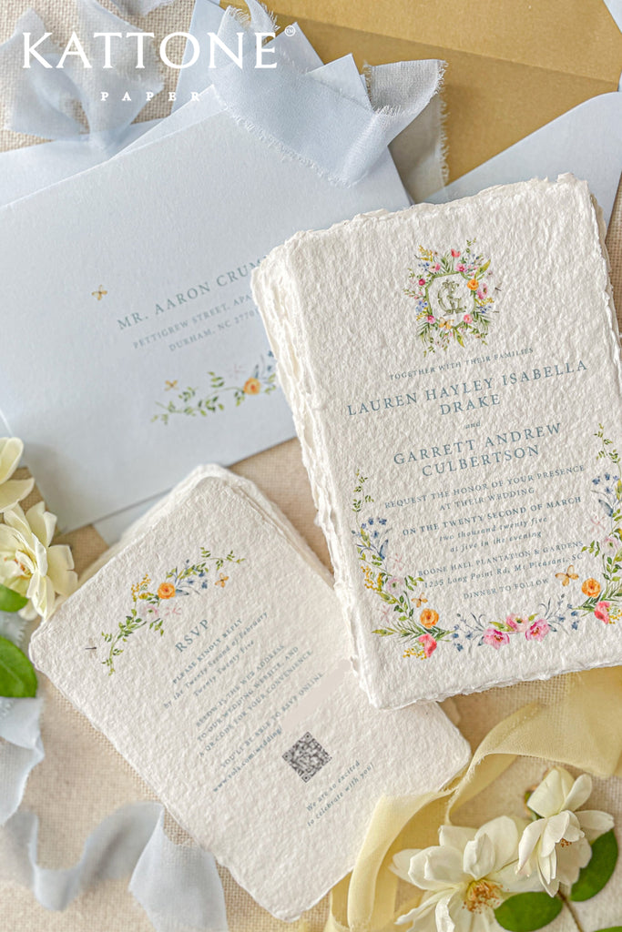 Safiya Handmade Paper and Watercolor Wreath Wedding Invitations