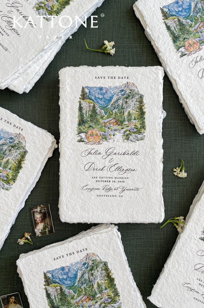 These handmade paper save the date cards feature a bespoke watercolor venue illustration, painted to capture the beauty and atmosphere of your wedding location. Printed on luxurious cotton paper with organic deckle edges, each card offers a soft, tactile finish and an elegant way to announce your celebration. Thoughtfully designed to feel personal and timeless, these save the dates create a lasting first impression and set the tone for a refined, art-driven wedding stationery suite.