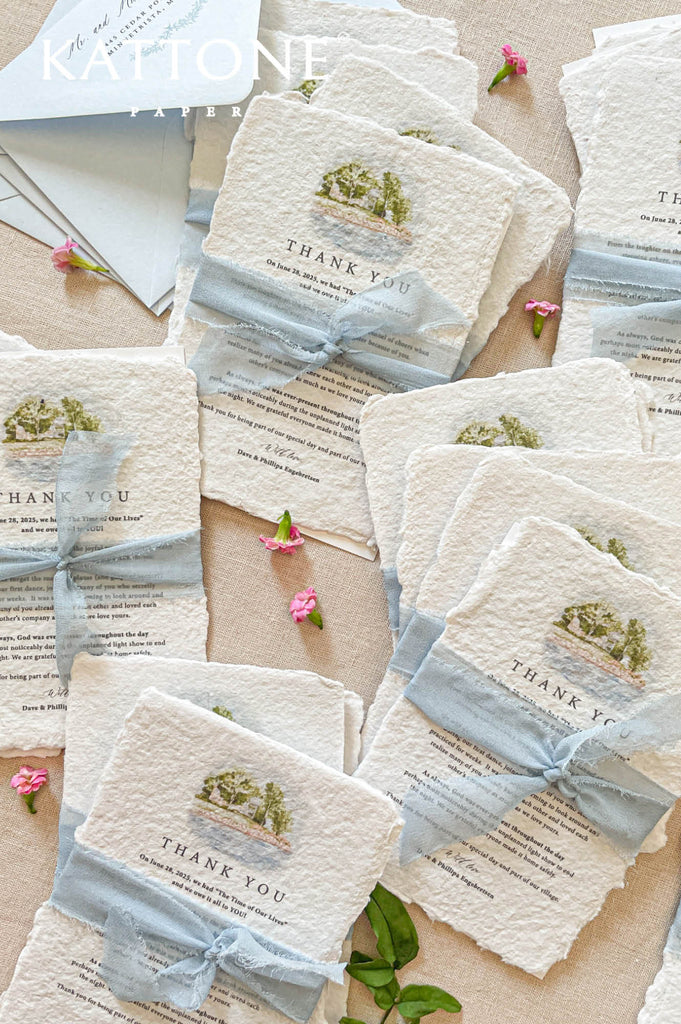 Handmade paper thank you cards are a beautiful way to express gratitude after your wedding day. Each card is individually crafted from premium cotton paper and personalized with a custom watercolor illustration of your venue, creating a lasting reminder of where your story was celebrated.